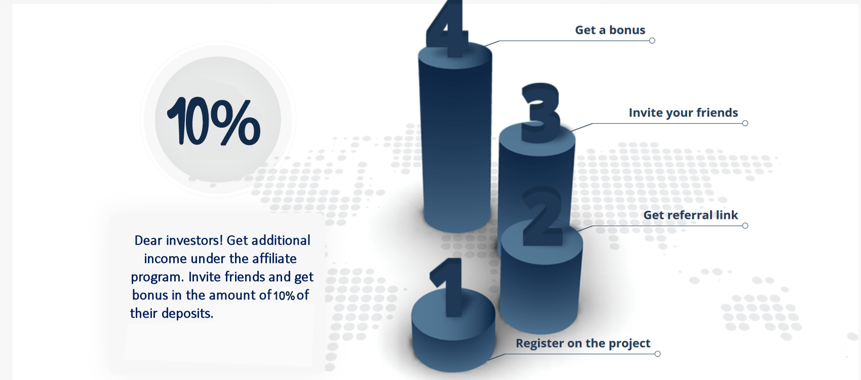 Affiliate Program is a type of marketing in which a business rewards one or more users for each visitor or customer brought by the user’s own marketing efforts. It is a program that include the accrual and payment of partnership rewards to users whose invited participants have created investments in the company’s investment program.